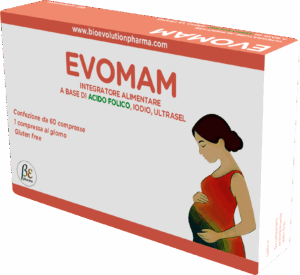 Evomam è un integratore alimentare a base di acido folico che contribuisce alla crescita dei tessuti materni in gravidanza, alla normale sintesi degli amminoacidi, alla normale emopoiesi, al normale metabolismo dell’omocisteina, alla normale funzione psicologica, alla normale funzione del sistema immunitario, alla riduzione della stanchezza e dell’affaticamento e interviene nel processo di divisione delle cellule; il Selenio contribuisce alla normale funzione tiroidea e alla normale funzione del sistema immunitario; lo Iodio contribuisce alla normale produzione di ormoni della tiroide e alla normale funzione tiroidea e al normale metabolismo energetico e alla normale funzione cognitiva.